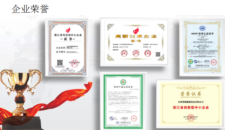 近年来,公司以市场为导向,坚定发展信心,依靠科技进步,推动转型升级。加强内部管理,提升竞争力,使公司得到了快速的发展。通过ISO22000:2005食品安全管理体系认证、BRC、海豚安全认证和清真认证,2010年获得全国食品质量安全市场准入(QS)企业,被中国罐头工业协会评为“中国罐头行业十强企业”,荣获 “国家级农业龙头企业”称号。“桔花牌”水果罐头被评为中国名牌。海之梦水产品被评为浙江省名牌,2007年企业被评为浙江省农业科技型企业。2008年企业信用被台州市工商局评为AAA级企业,2008年荣获台州市十佳农业龙头企业。2010年被黄岩区评为诚信守法企业和劳动关系和谐企业,2011年桔花牌桔子罐头和金枪鱼营养鱼酥被评为浙江省农博会金奖。